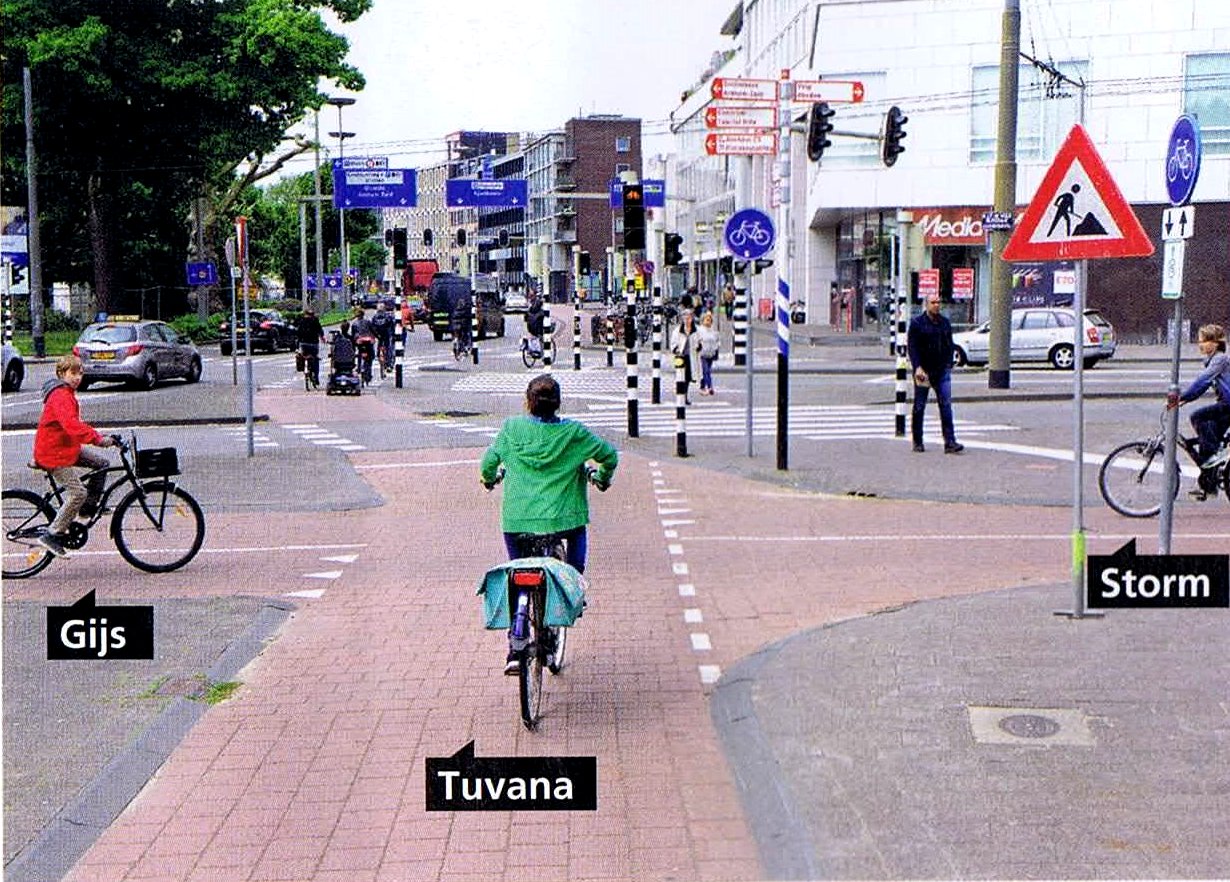 Luuk: Tuvana moet nu stoppen. Dat kan nog gemakkelijk. Zo meteen wordt het licht rood en gaan de auto's van links rijden.