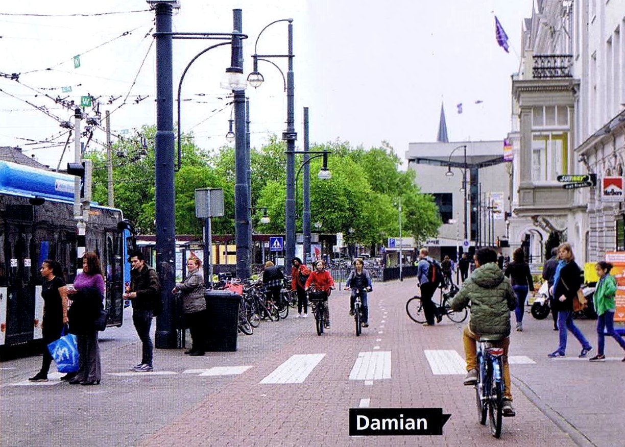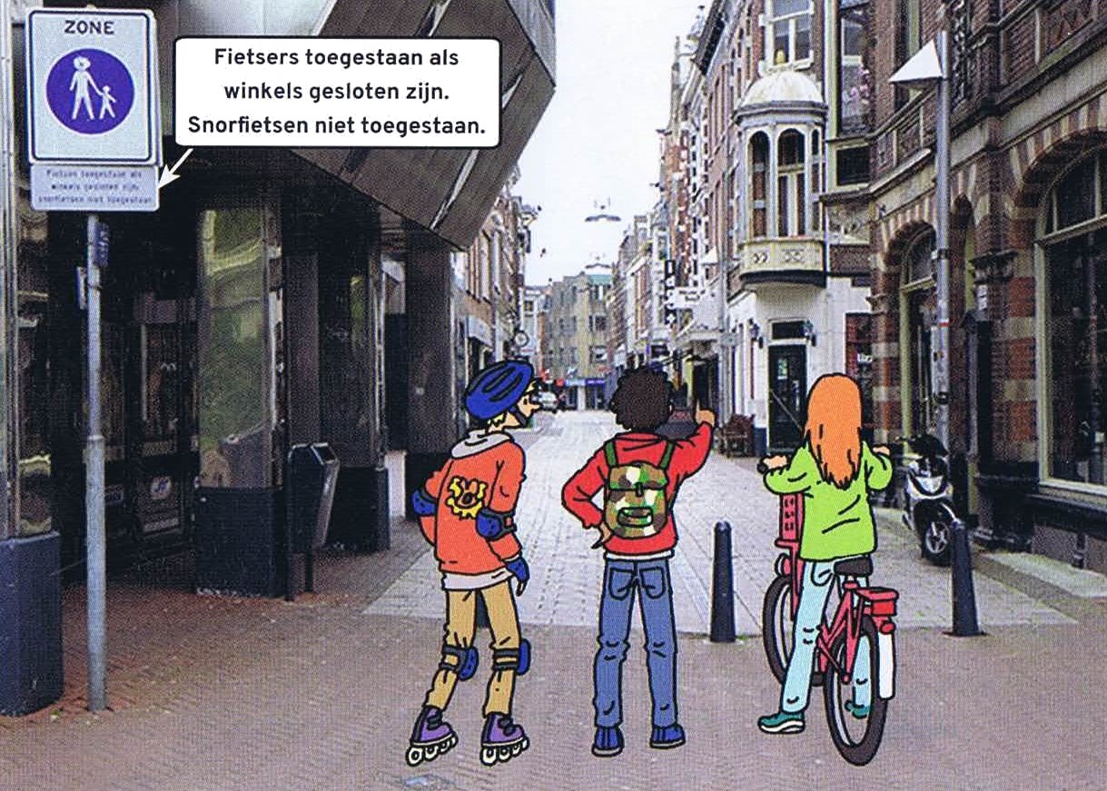 Als de fietser heel langzaam rijdt, mag zij samen met de voetganger en de skater de winkelstraat in.