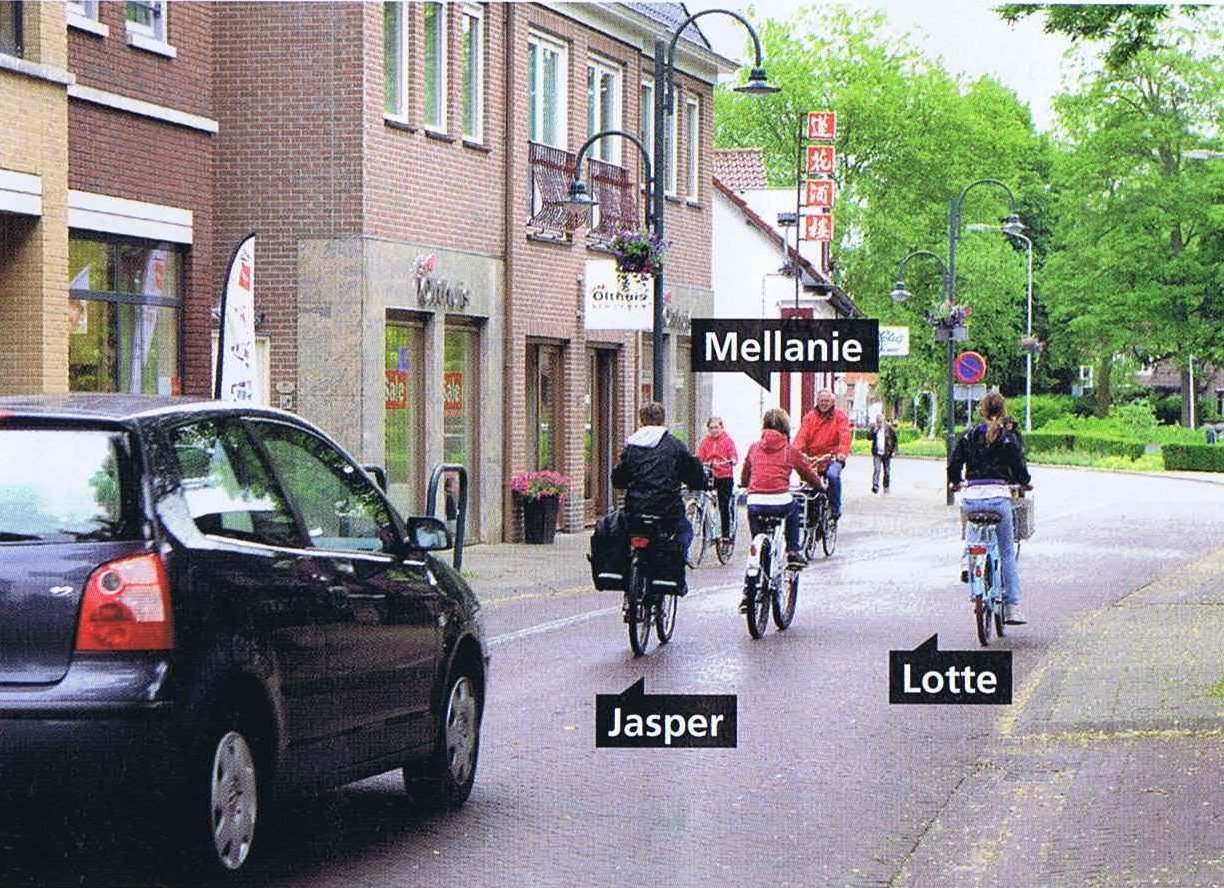 Jasper, Mellanie en Lotte fietsen met z'n drieën in de winkelstraat. Drie kinderen praten over de foto Wie heeft gelijk?