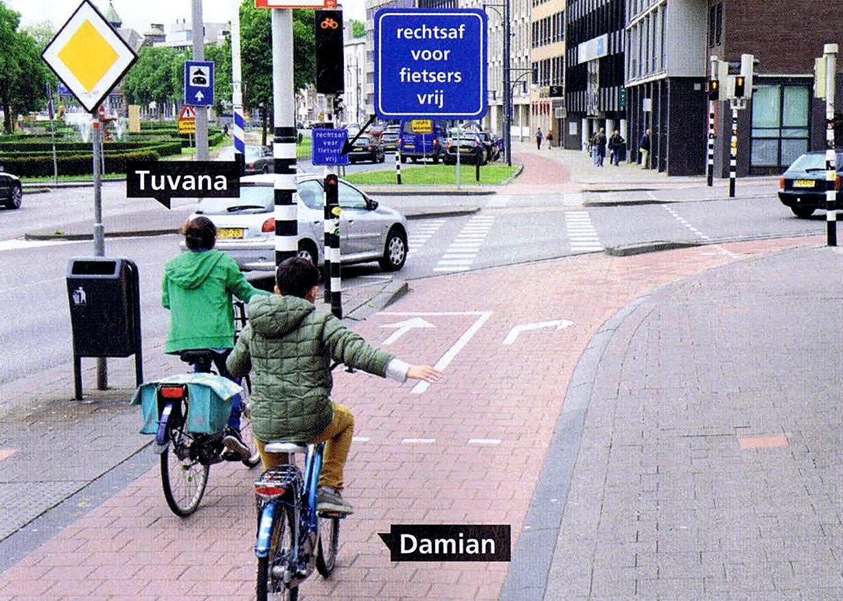 De fietsers komen bij een verkeerslicht met een onderbord. Tuvana wil rechtdoor, Damian wil rechtsaf. Wat is waar?