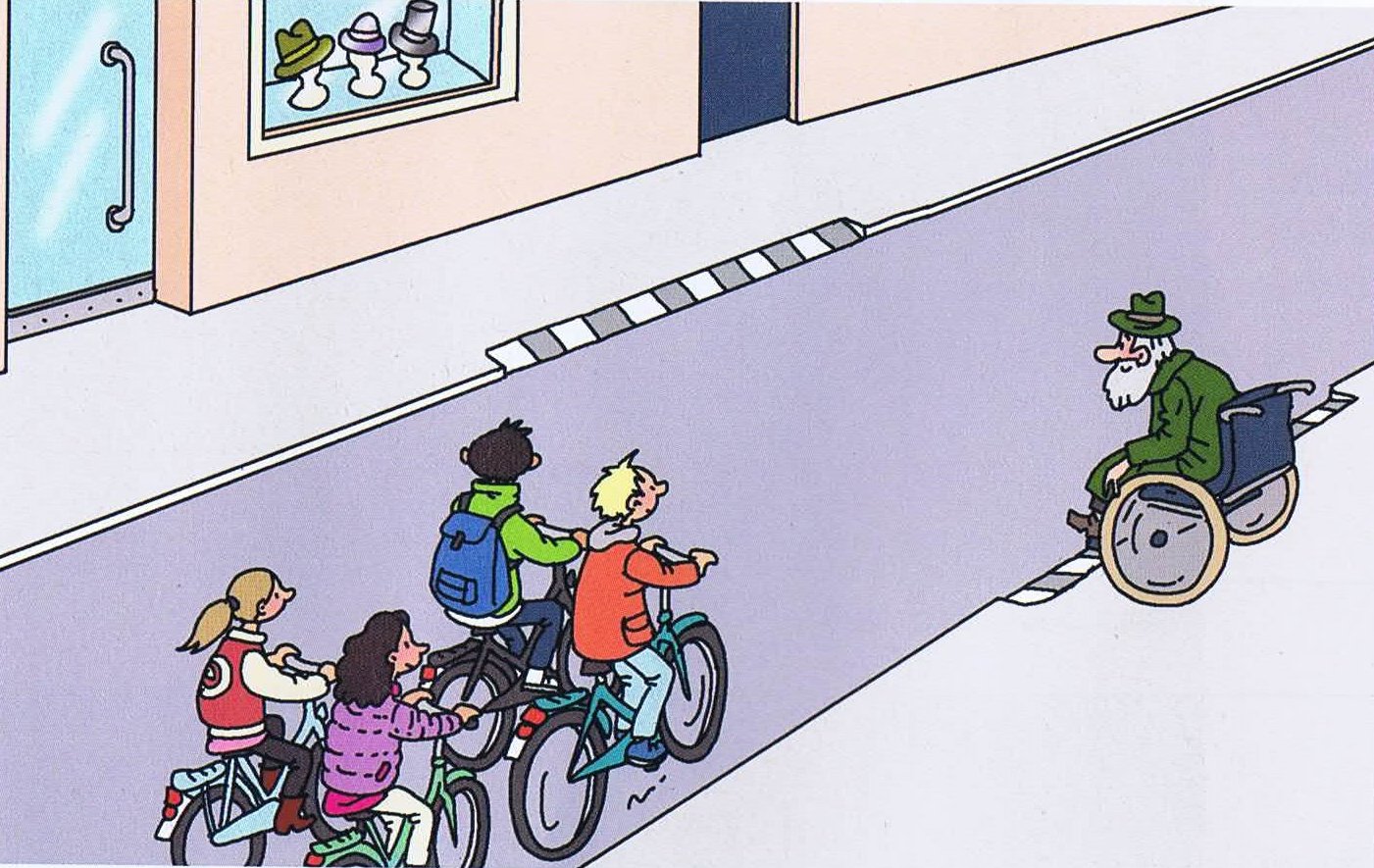 De man in de rolstoel wil oversteken.Moeten de fietsers hem voor laten gaan?