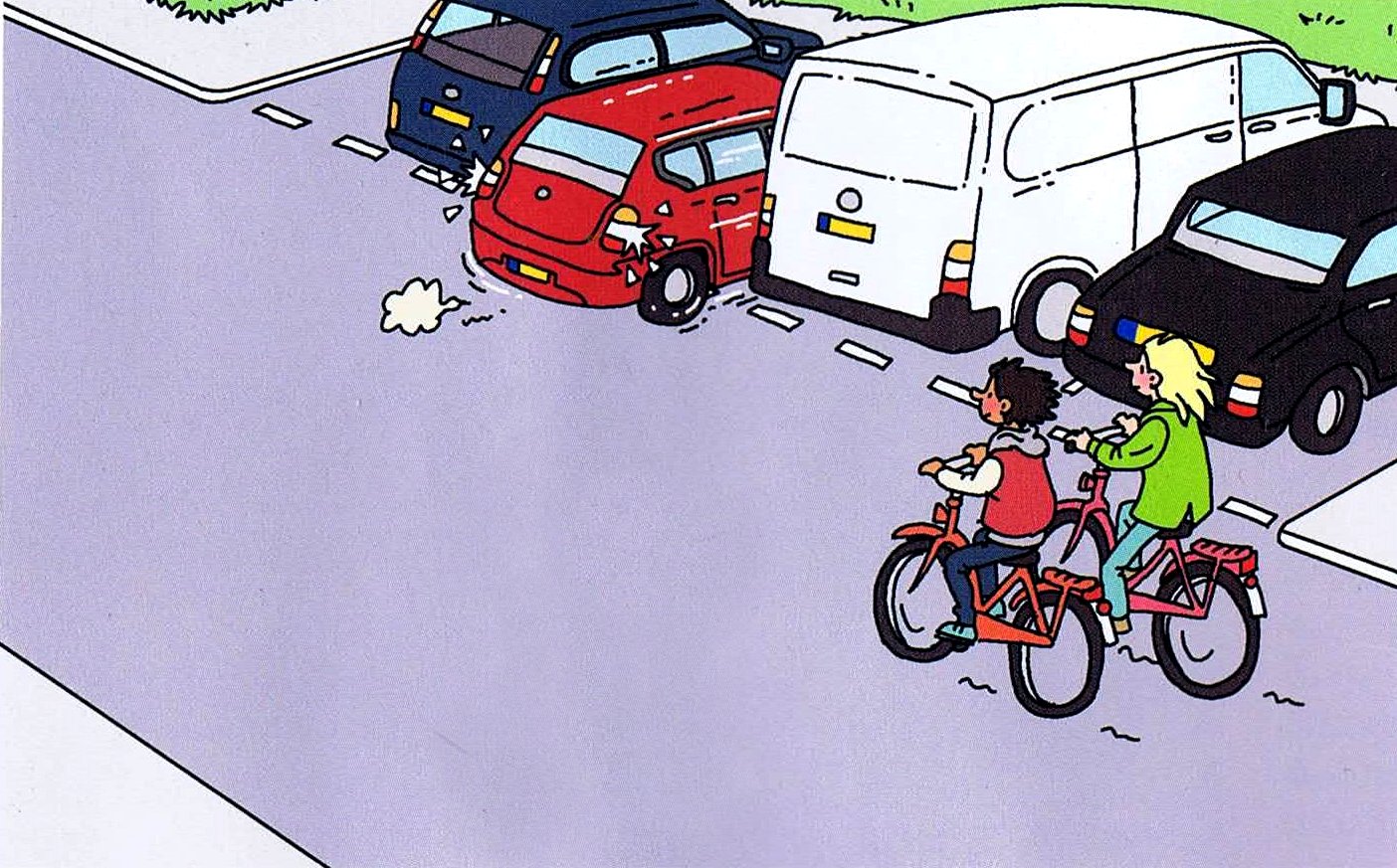 De fietsers krijgen te maken met een achteruitrijdende auto. Wat moeten zij doen?
