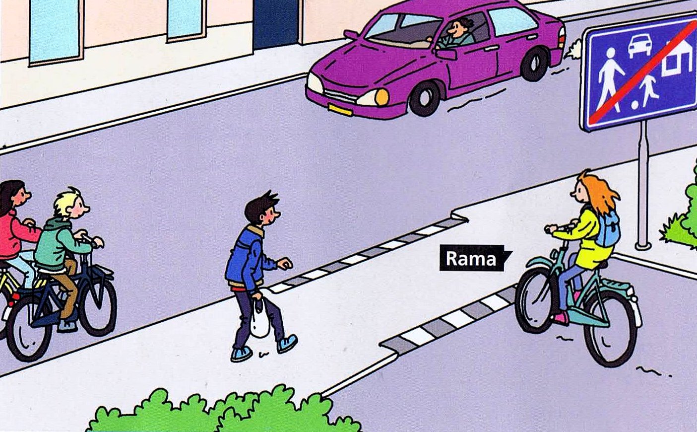 De kinderen mogen alle drie de straat in, maar dan moeten de skater en de fietser gaan lopen. Ze mogen nu niet skaten en fietsen.