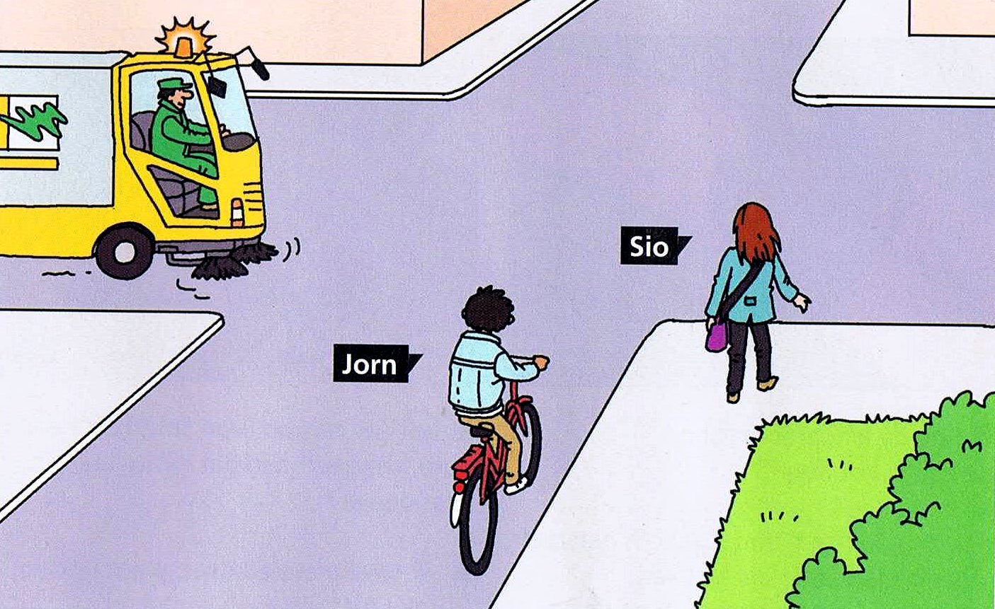 Jorn en Sio krijgen te maken met een veegauto.Welke zin is waar?