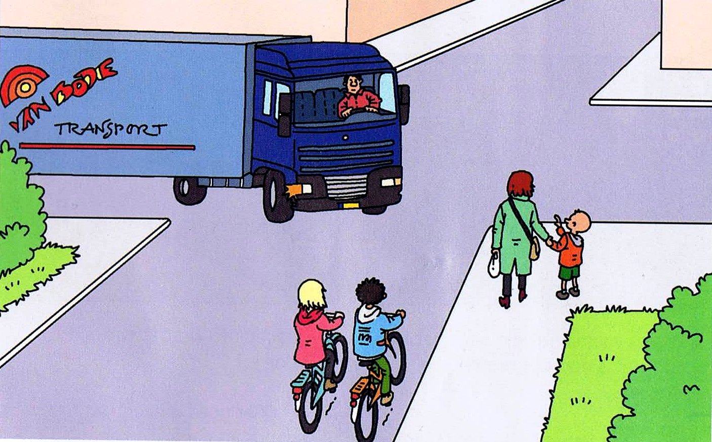 De fietsers krijgen te maken met een vrachtauto die de bocht om komt.Drie kinderen praten over deze tekening.Wie heeft gelijk?