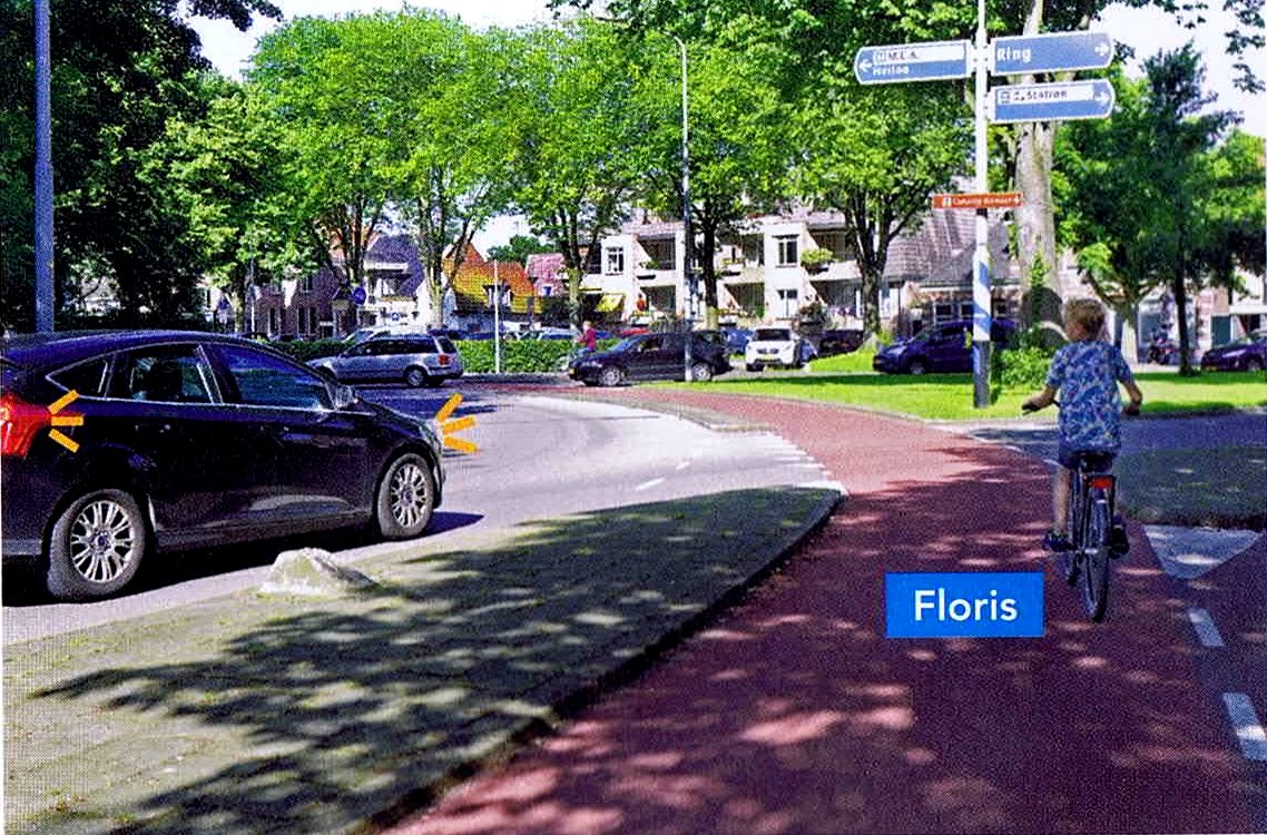 Floris wil over het fietspad verder rijden. De auto wil rechtsaf.Welke zin is waar?
