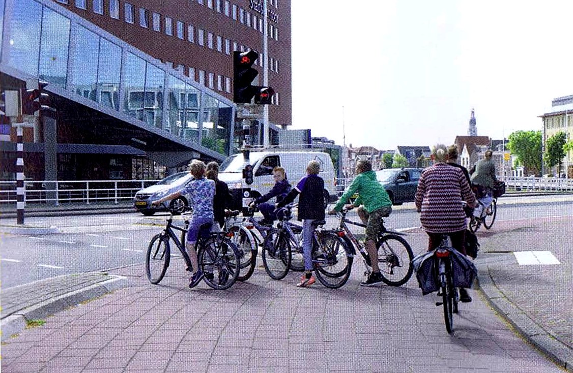 Maja: De fietsers kunnen zo niet blijven staan. De voorste fietsers moeten goed uitkijken en als er geen verkeer aankomst, vast oversteken. Ook al is het licht nog rood.