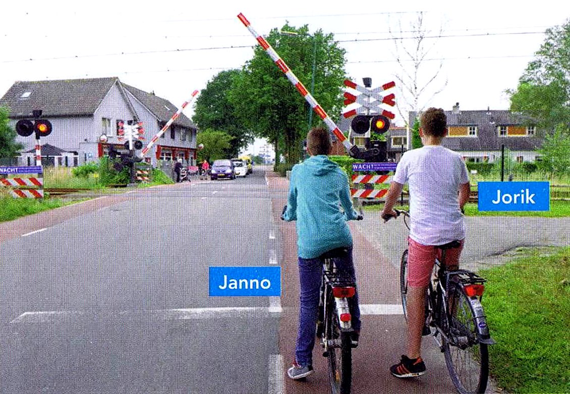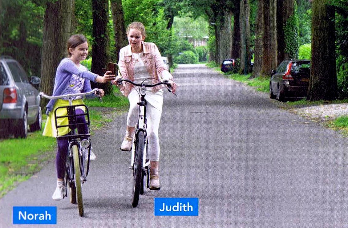 Kijk waar Norah en Judith fietsen en waar Cor en Youri lopen.