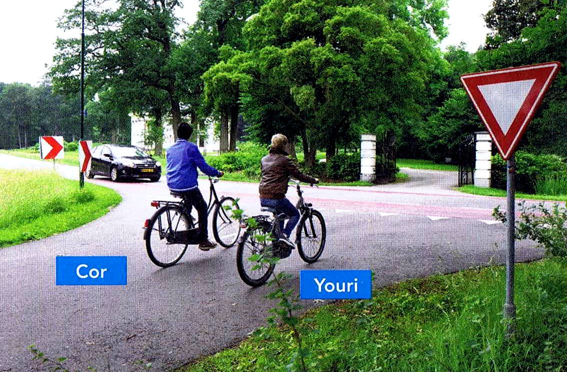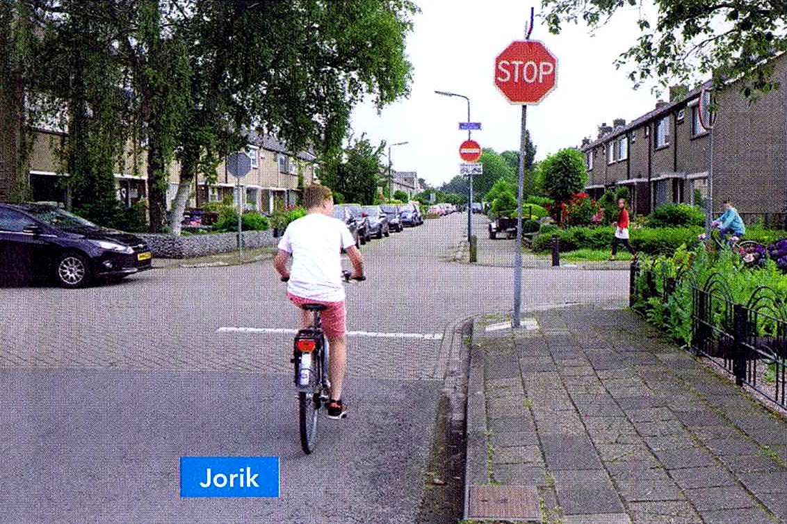 Jorik moet stoppen en de auto en de fietser voor laten gaan.