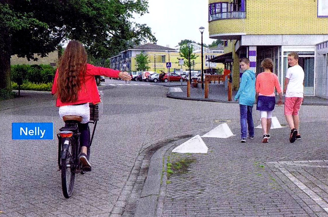 : Het is veiliger als de kinderen even afstappen en rechts in de berm wachten.