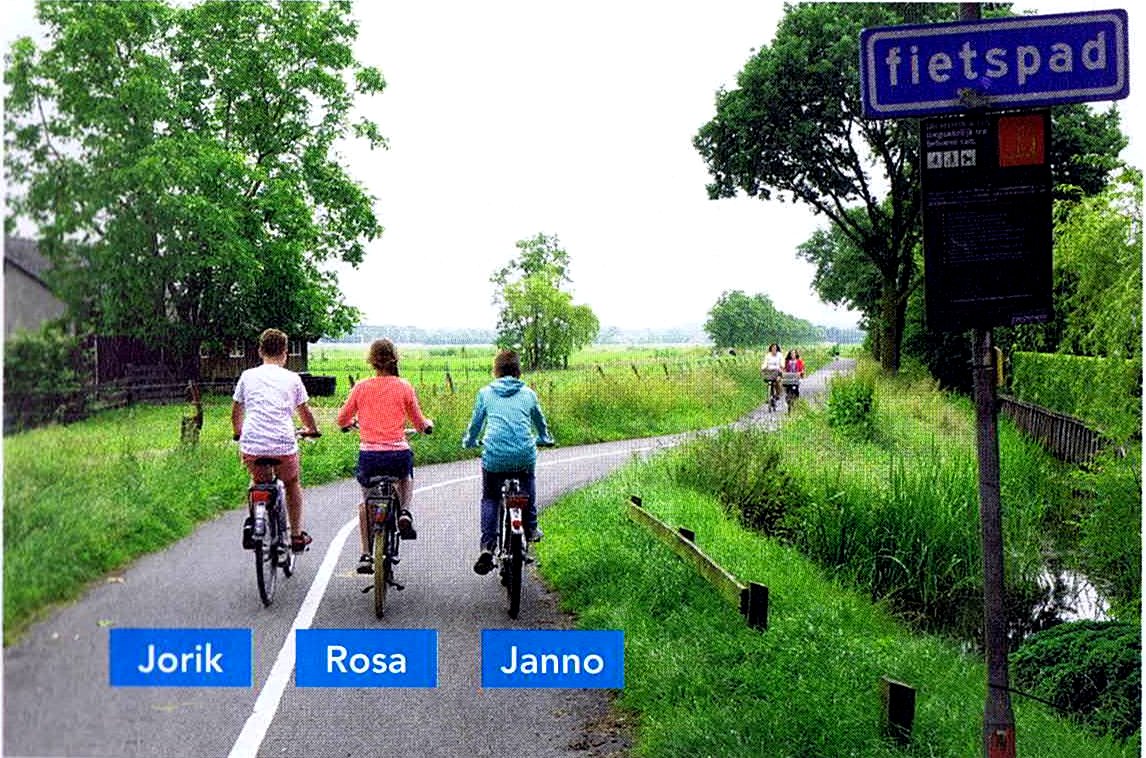 Jorik moet voor of achter Rosa en Janno gaan fietsen.