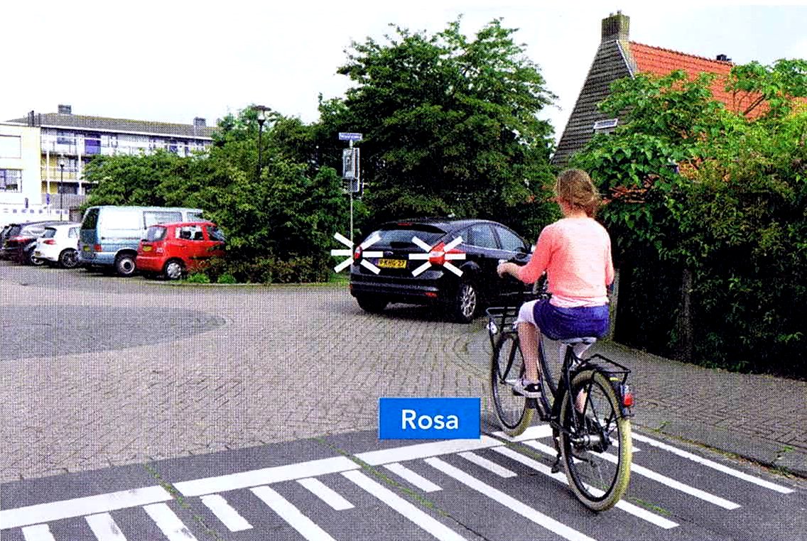 Rosa komt bij een kruispunt. Een auto komt achteruit rijden.
