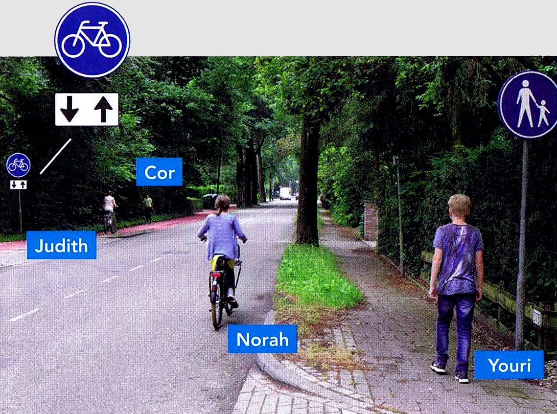: De weg is te smal om zo door te rijden. Het is veiliger als de kinderen in de berm gaan rijden.