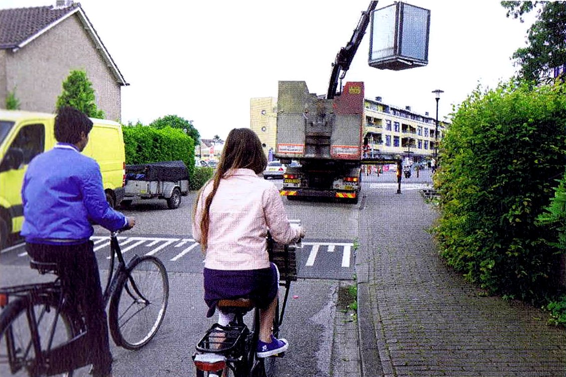 De fietsers moeten de vrachtauto nu over de stoep voorbijrijden.