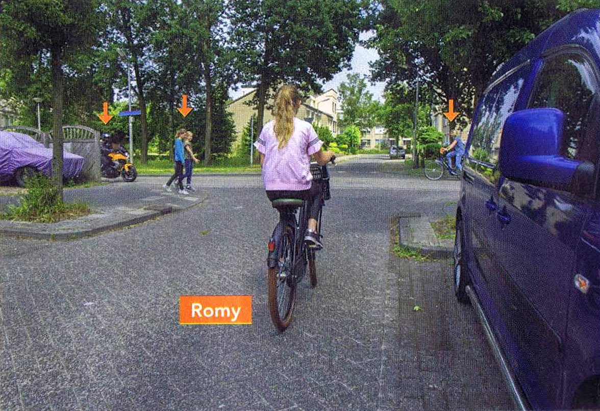 Dat Romy geen voorrang krijgt van de fietser, omdat deze haar niet op tijd ziet.