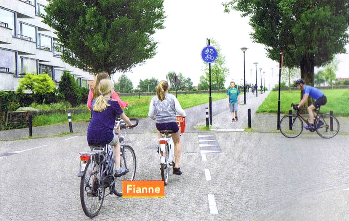 Het rennende meisje dat het fietspad op loopt. - De fietser voor Elif die afremt. - De skateboarder.