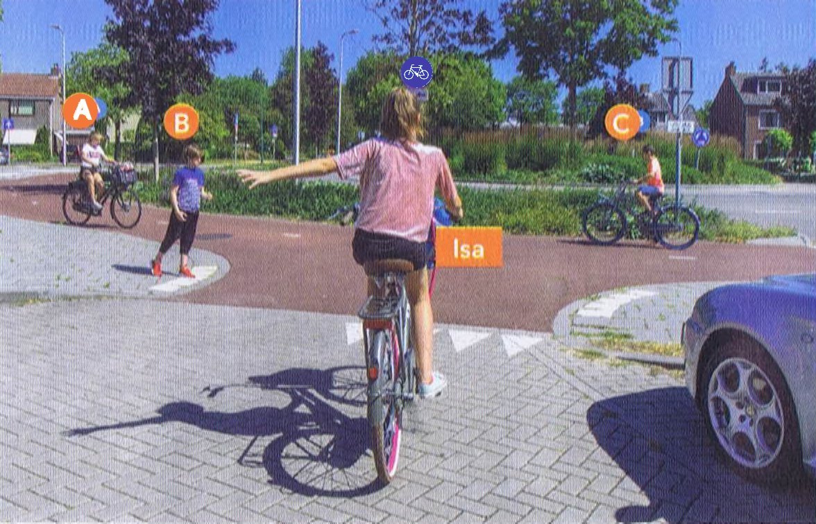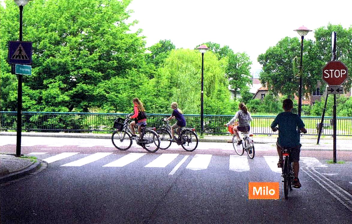 Milo fietst met zijn vrienden. Ze naderen deze kruising. Wat kan Milo nu het beste doen?