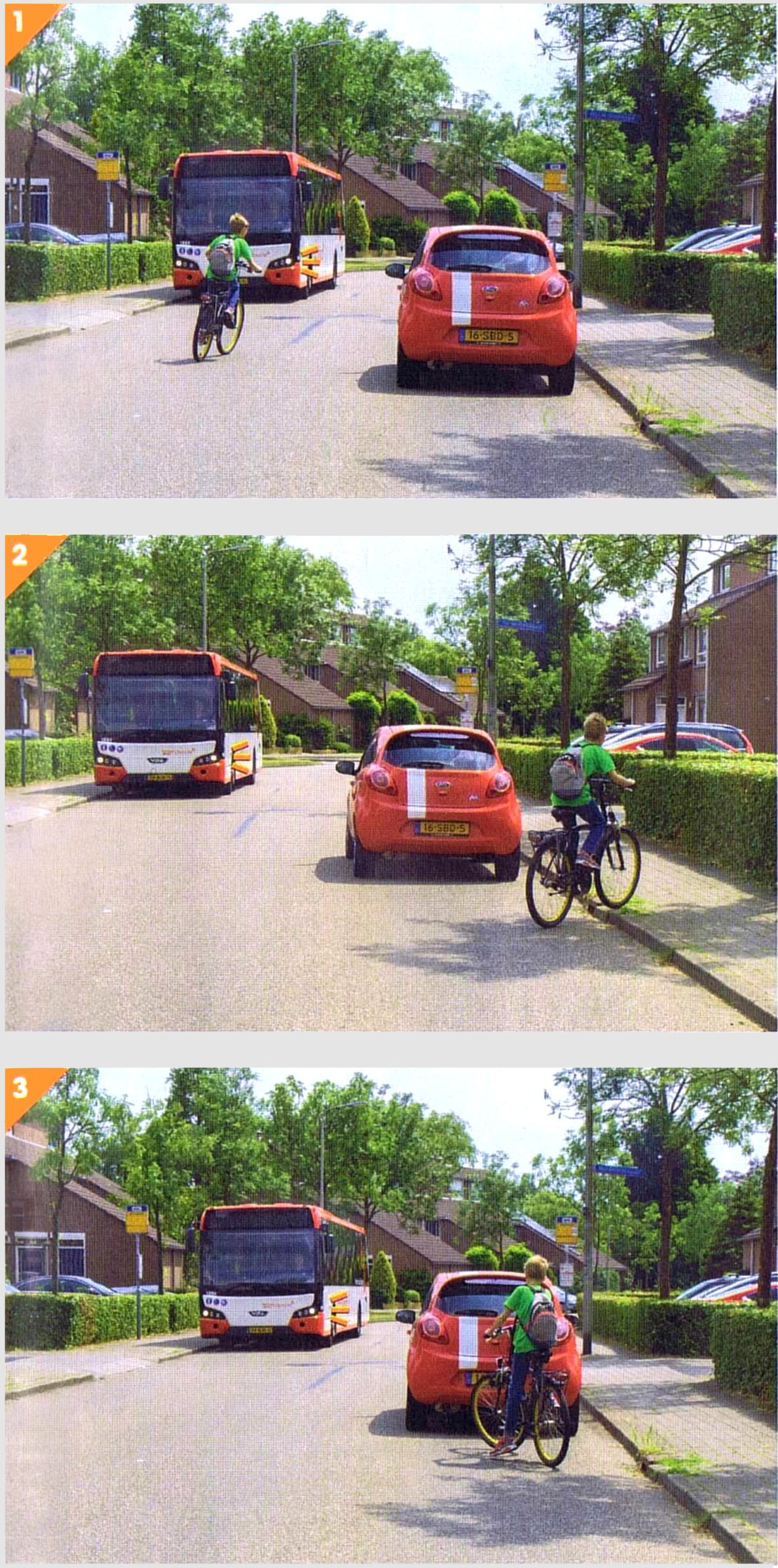 Mees fietst en ziet voor zich een stilstaande auto. En een bus wil wegrijden. Wat kan Mees het beste doen?